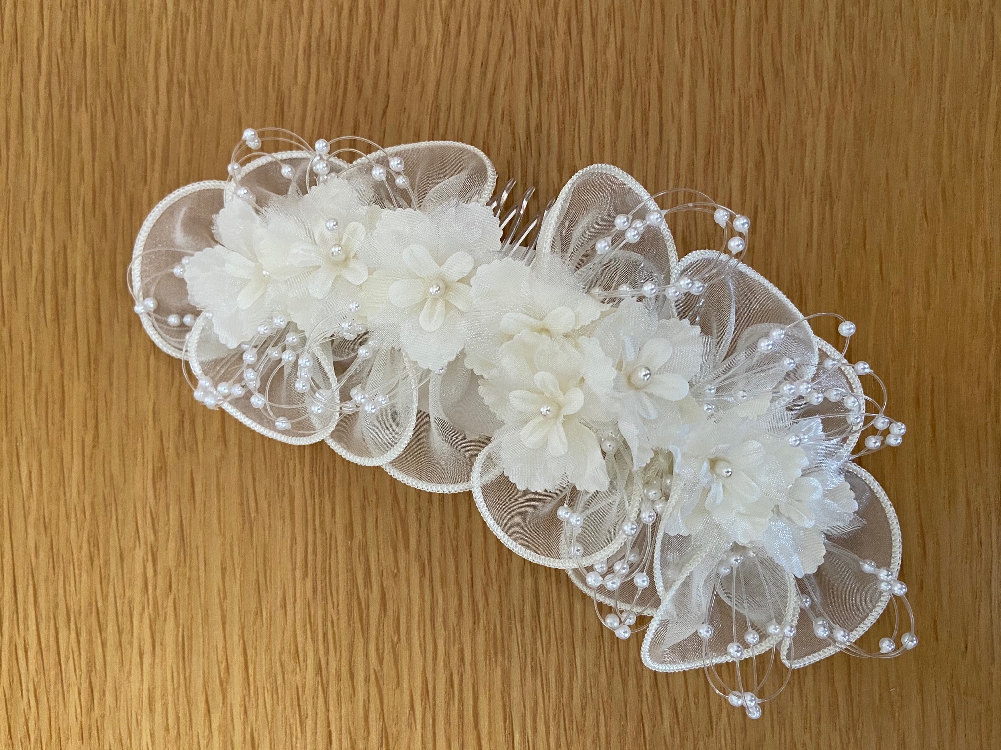 Ivory flowers on a bed of organza 'leaves'. Decorated with loops of pearls. Built on a clear comb in a slight curve.