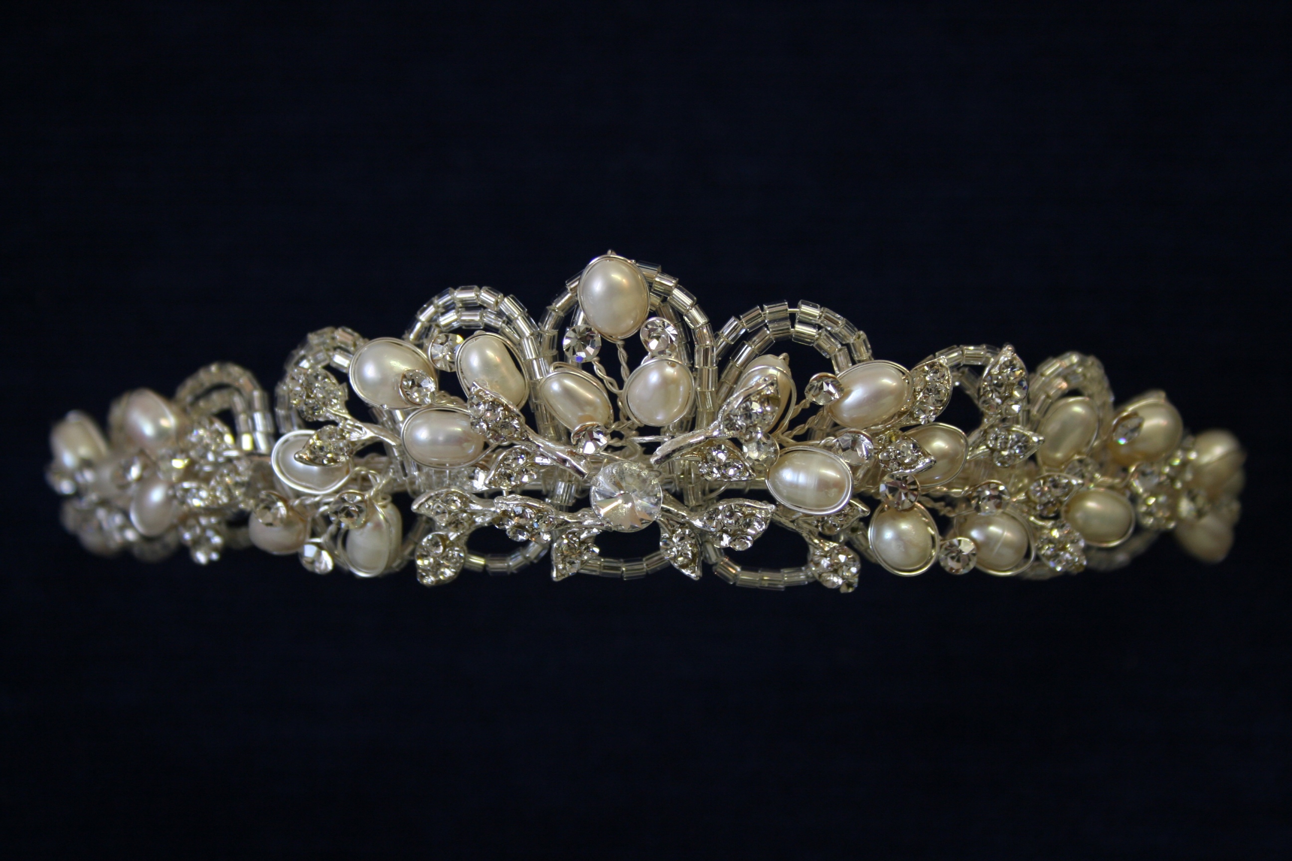 Chunky low height tiara with pearls, diamante and crystal blocks on a silver base. Very high quality.