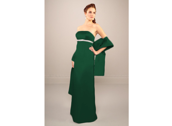 This bridesmaid dress has been hired once but is in perfect condition. It is a dark emerald green colour, or bottle green, depending on your view - or even 'forest green' as labelled by the manufacturer! The main dress is in a matte satin in a very gentle A-line, just enough not to need a kick split at the back, and is fully lined. The under bust band and bow is in ivory matte satin. It fastens with a zip with covered buttons as a trim. The bodice has padded cups and is boned. There are optional shoestring straps.