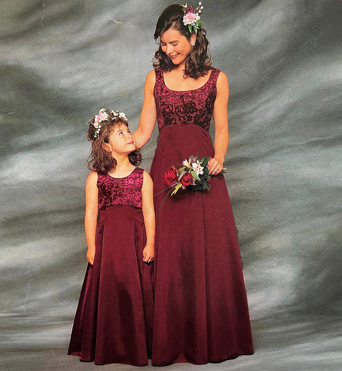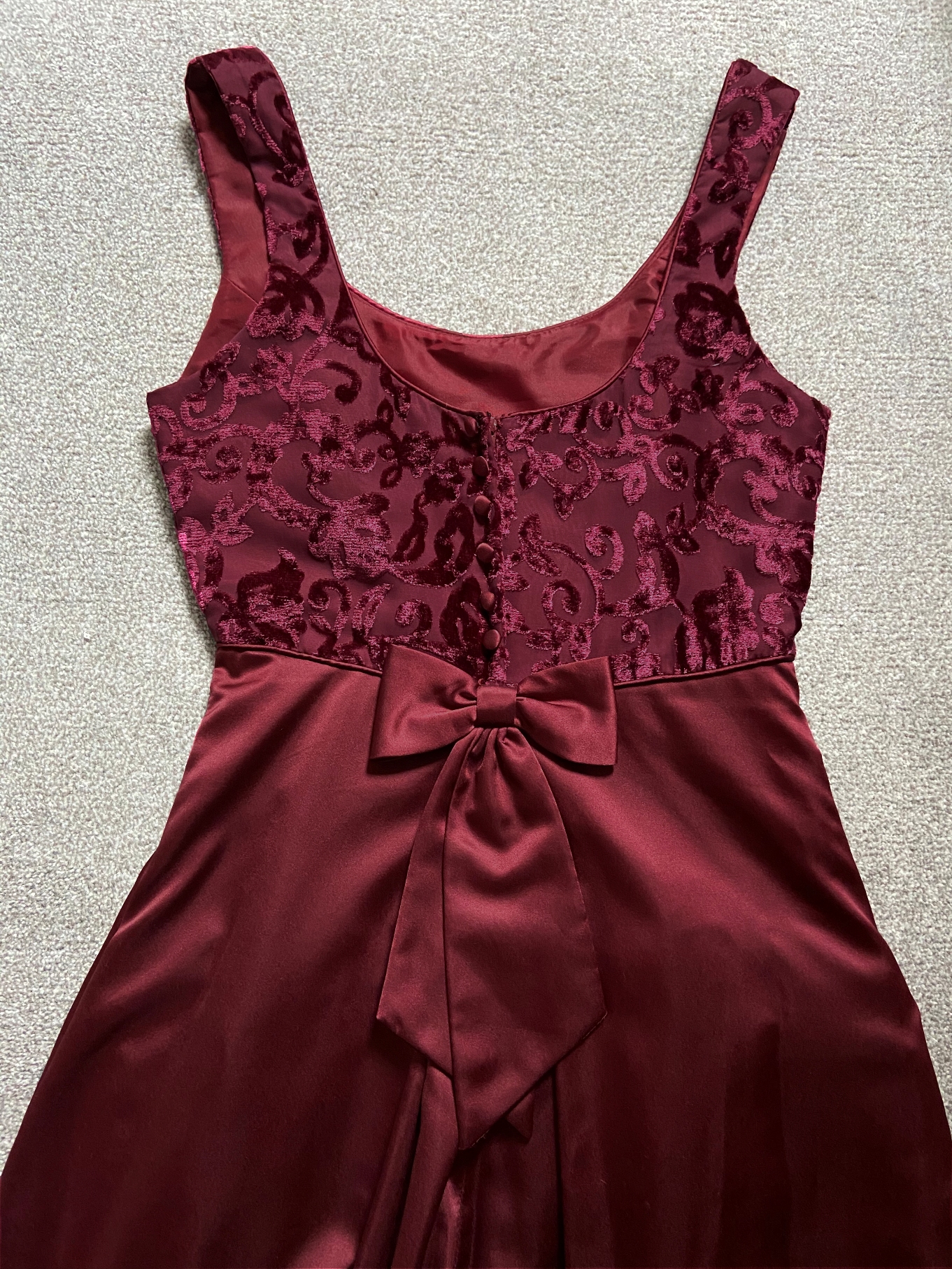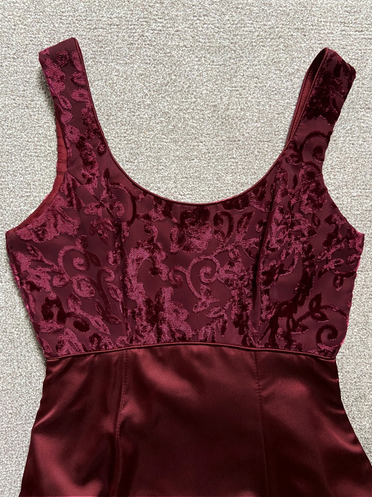 Princess line bridesmaid dress in burgundy matte stain with devore bodice (a velvety pattern on a plain background). Fully lined with built in nets (can be removed).U- shape neckline front and back. Fastens with a zip and finished with a bow. Again, this can be removed.