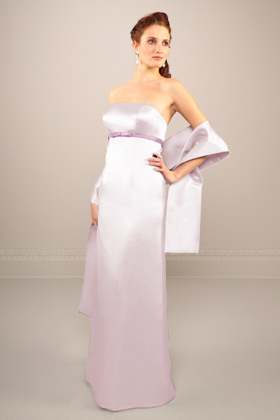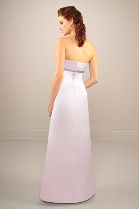The main dress is in a delicate 'ice pink' matte satin in a very gentle A-line, just enough not to need a kick split at the back, and is fully lined. The under bust band and bow is in a victorian rose matte satin.(It's only the camera flash that makes it look so shiny). It fastens with a zip with covered buttons as a trim. The bodice has padded cups and is boned. There are optional shoestring straps.