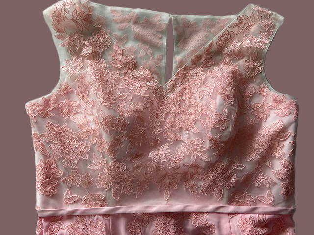 Chiffon bridesmaid dress with guipure lace trim and illusion back. Double lined and with a boned bodice. The guipure lace is sewn onto tulle which overlays the sweetheart neckline shape of the lining. Chiffon and lining are in baby pink and the lace is slightly darker.