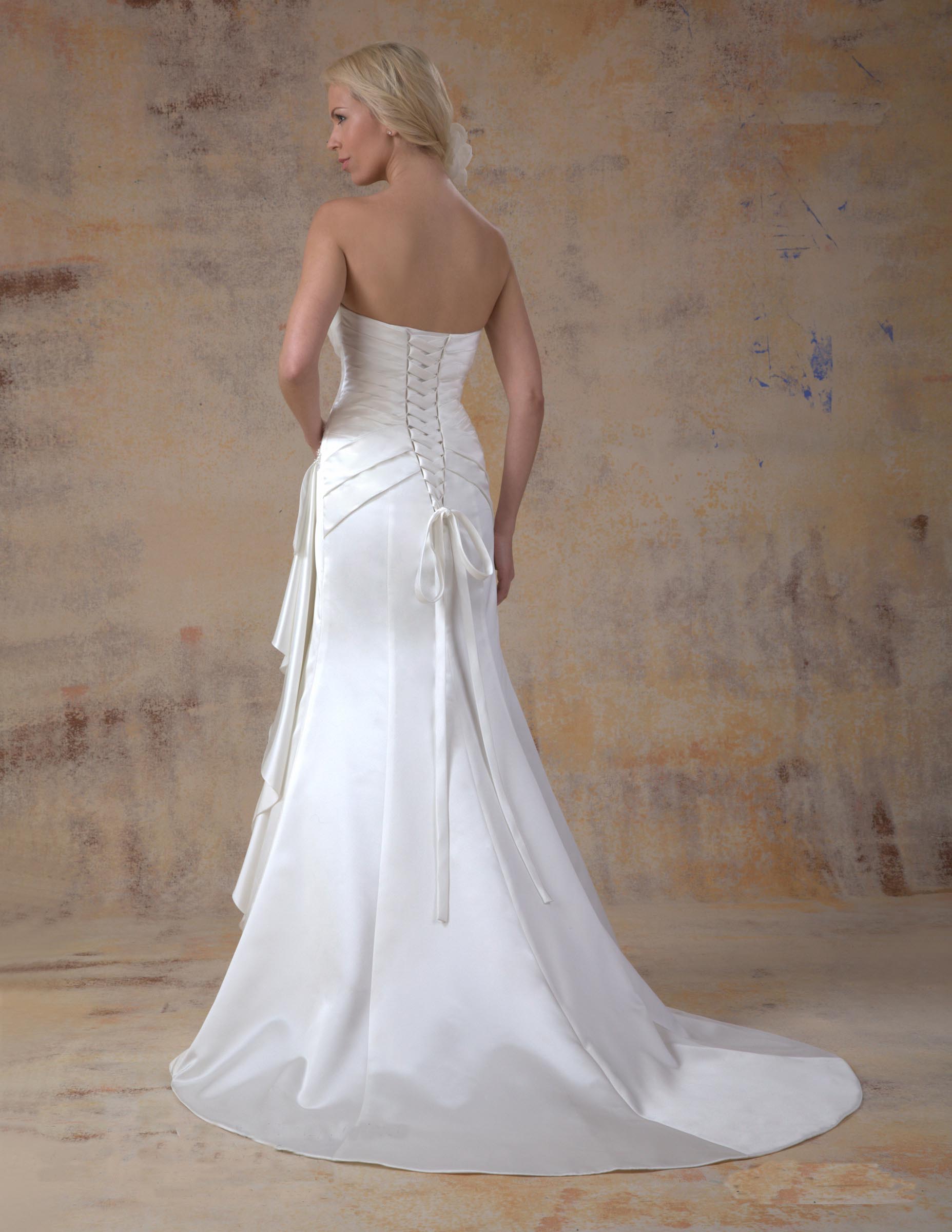 Fitted strapless dress in ivory matte satin with a small train. Pleated bodice and corset-style back. Flares out gently in a tulip shape from just below the hips.