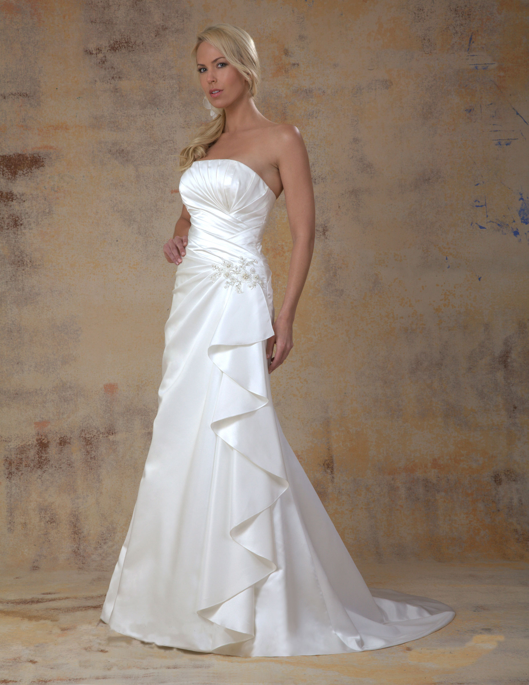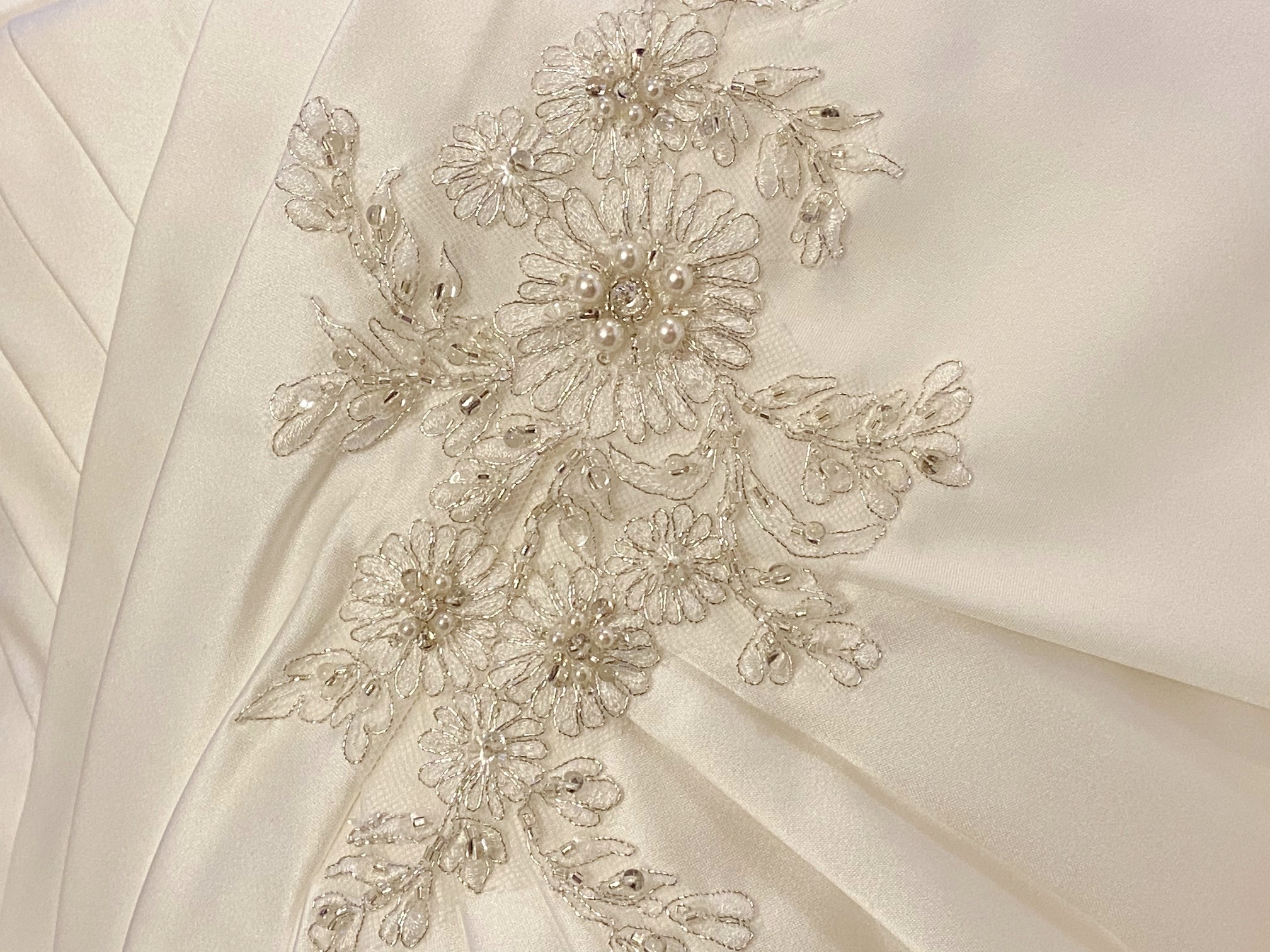 Subtle silver-edged embroidered decoration with pearls and diamante. Waterfall of fabric falls from the hip.