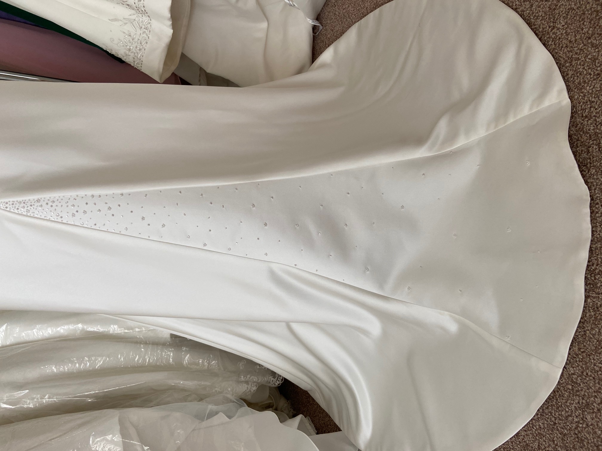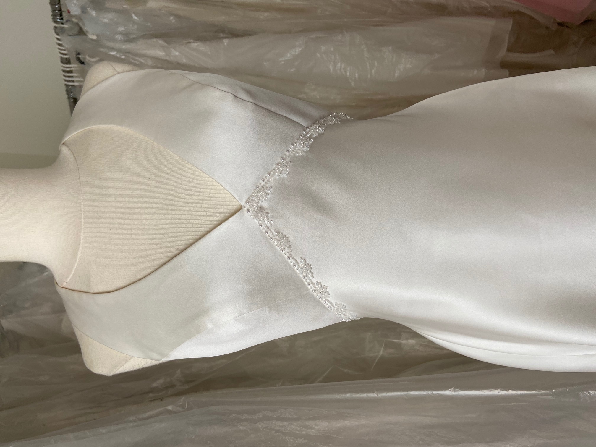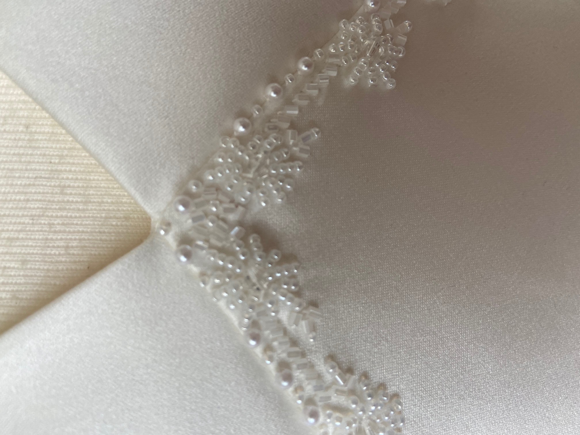 Embroidered with seed pearls and ivory crystal blocks under the bust and on train insert. Fully lined.