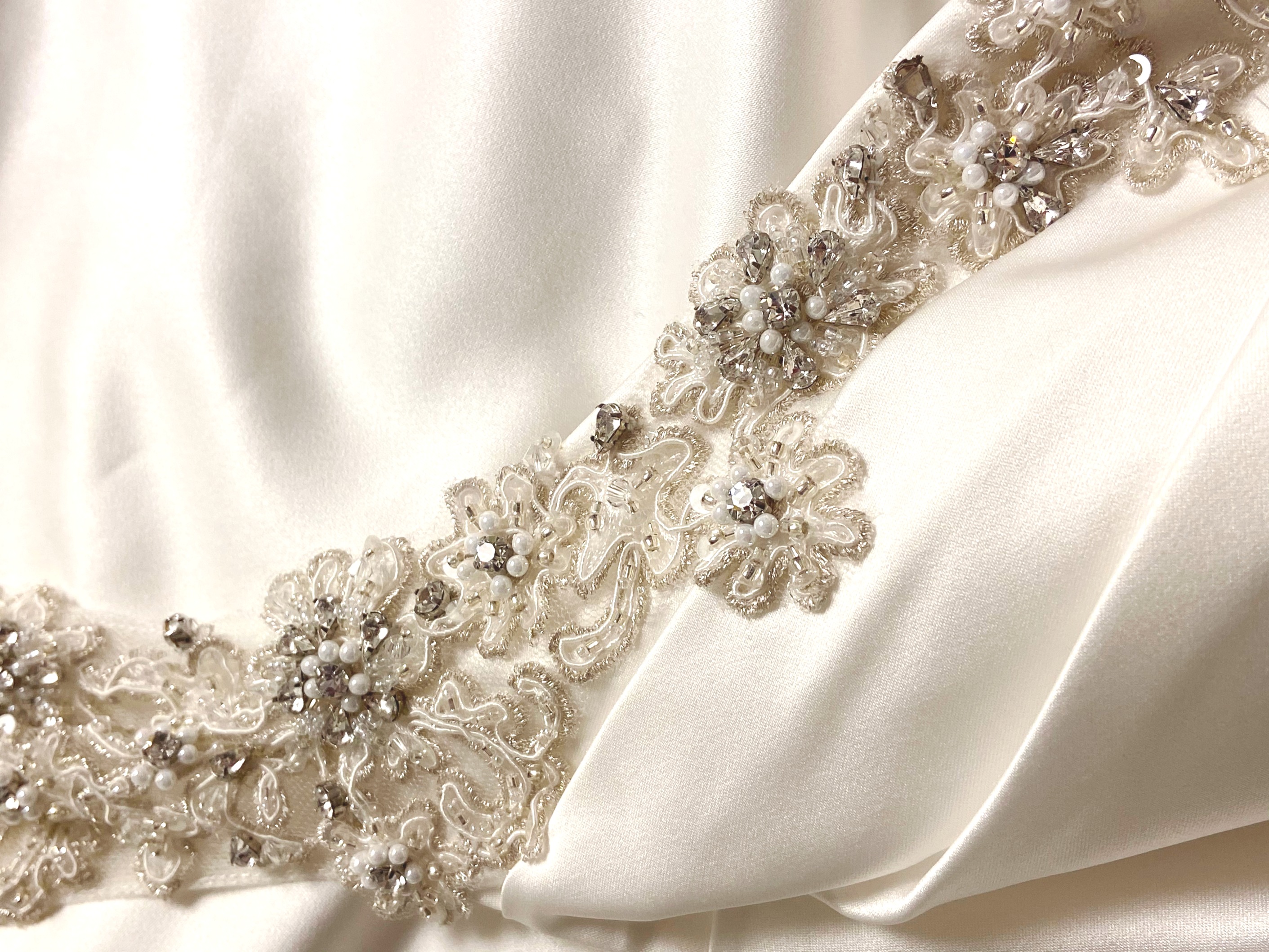 Ivory soft satin bridal gown with train. Asymmetrical ruching to flatter the tummy.