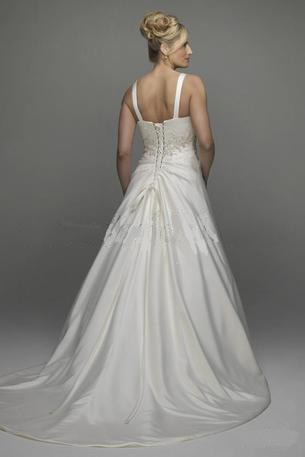Traditional wedding dress in matte satin with train. With or without straps. Very elegant with flattering pleating at the midriff.